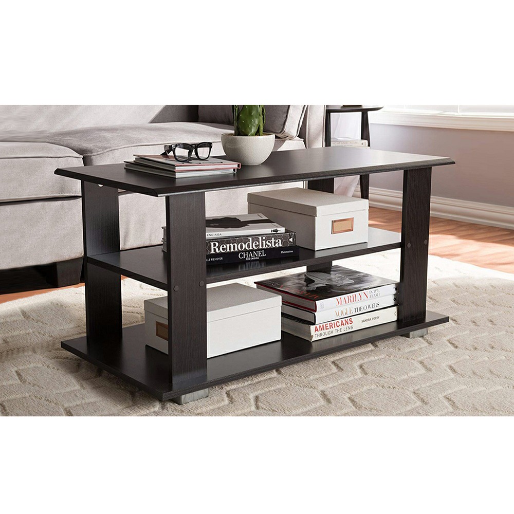 A sleek, simple, modern 3-tier coffee table is an essential addition to your living room. The modern and contemporary-inspired design emphasizes clean lines and geometric shapes. The table features a smooth, rectangular table top, with two rectangular shelves underneath.