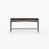 The table has enough height and space to provide relaxed positioning of legs while you sit and work on it. Contemporary look wood office desk boasts a modern and bold look, suitable for all contemporary setup. The table is provided with a cable snake for an efficient wire management to allow you to work in a clutter-free space. Enhanced privacy the desk organiser comes with a lockable storage compartment to secure your private and confidential belongings. A slim dark desk is carefully curated to blend in with the overall decor. The fireplace and the oversized pouf are eclectic yet warm home accessories in a highly glamorous space.