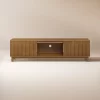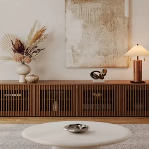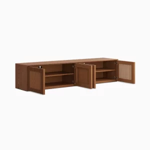 Discover our solid wood slat TV stand, combining natural beauty with modern design. Made from premium material, this sleek piece features an open-slat style, offering both minimalist elegance and practical storage. Its durable construction and natural wood grain add warmth and sophistication to any room.