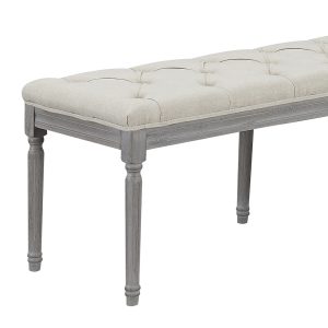 Place this handsome weathered Beige Upholstered Tufted Bench at the foot of your bed for a comfortable place to put on the evening’s slippers or the morning’s work shoes. Two extra legs in the center provide the elegant bench with extra sturdiness if you decide to use it in the living room for overflow seating.