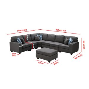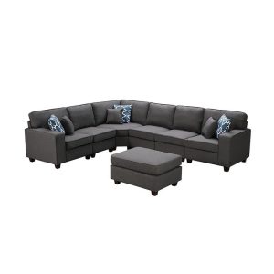 This beautiful 7-piece modular sectional sofa comes with an ottoman and will fit into any living room and impress your guests. The comfortable dark gray linen fabric with matching accent pillows will light up your living room with the most trendiest of looks. The size will allow you to welcome multiple guests where everyone will be able to enjoy entertainment together.