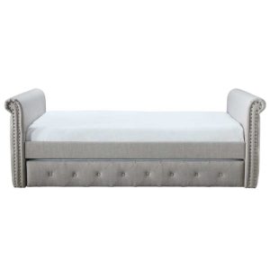 Style a guest bedroom or child’s room with the classic Chester Daybed with Trundle. The upholstered, twin-sized frame features rolled arms, button-tufted sides, and a pull-out trundle for overnight guests. Choose from three upholstery colors to complement your existing décor.