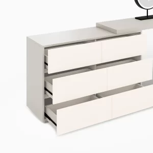Embodying modern simplicity, this low-profile vanity in matte white offers streamlined storage, complemented by a sleek tabletop for refined functionality in personal styling.