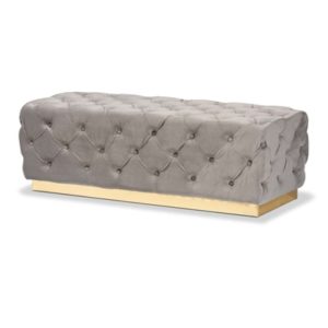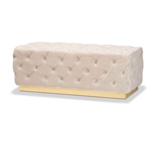 Elevate your space with the luxurious design of Blue Velvet Ottoman . Corrine is comprised of a solid wood frame padded with a plush layer of foam and upholstered in soft, sumptuous velvet fabric. All over button tufting lends striking visual appeal from any angle. Ottoman features a gold-tone base for added glamour. With both stunning style and cozy comfort, the Corrine ottoman adds the perfect touch of grandeur to any space.
