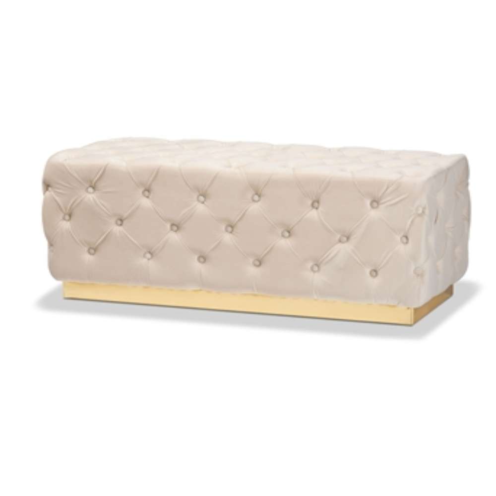 Elevate your space with the luxurious design of Blue Velvet Ottoman . Corrine is comprised of a solid wood frame padded with a plush layer of foam and upholstered in soft, sumptuous velvet fabric. All over button tufting lends striking visual appeal from any angle. Ottoman features a gold-tone base for added glamour. With both stunning style and cozy comfort, the Corrine ottoman adds the perfect touch of grandeur to any space.