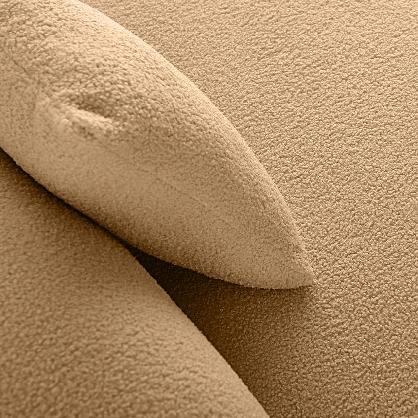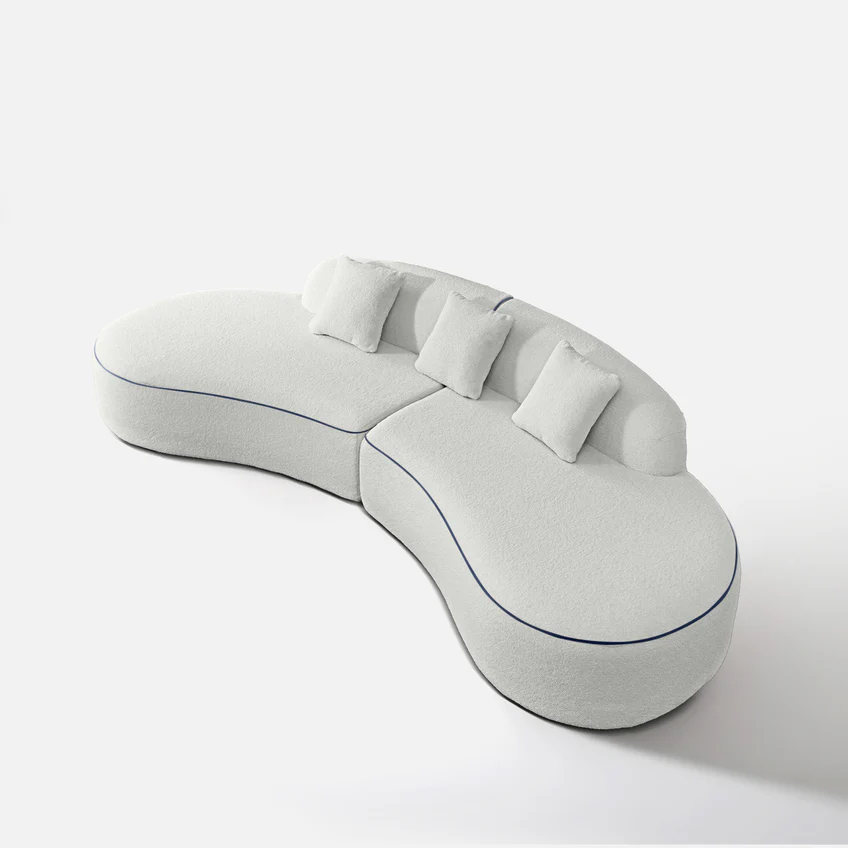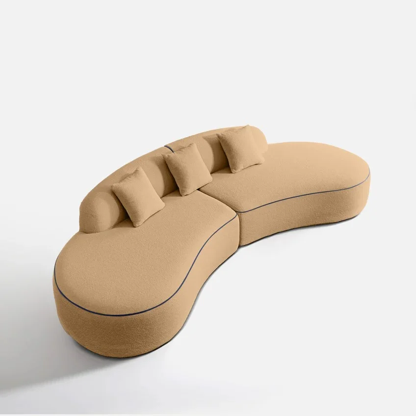 The Dahlia Curvy Sectional Sofa  is a gorgeous fusion of modern Scandinavian aesthetics and elegant curvature, offering an ideal corner sofa design for those seeking spaciousness paired with timeless style. With a curvy chaise and contrasting Oxford Blue piping that enhances its silhouette, this sectional brings a polished take to the modern L-shape sofa design. Upholstered in warm cookie-colored boucle fabric, it creates a cozy yet sophisticated ambiance, perfect for any living room setting.