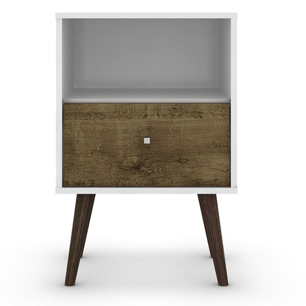 More than just a platform to perch reading lamps, glasses of water, and alarm clocks, nightstands help define the overall aesthetic and look in your guest bedroom or master suite ensemble. This piece, crafted from a manufactured wood frame, sits atop four Cobb-style legs and showcases a mid-century modern aesthetic, perfect for rounding out your curated aesthetic. It features an open shelf and a single lower drawer on roller glides for stashing your stuff out of sight.