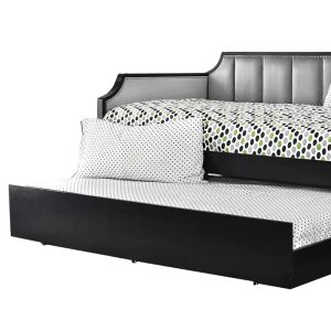 Complete the look of your living room with this contemporary style upholstered wooden daybed. Featuring fabric upholstery in gray with vertical tufting details, it is complemented with nail head trim details around the corners, rested on block legs.