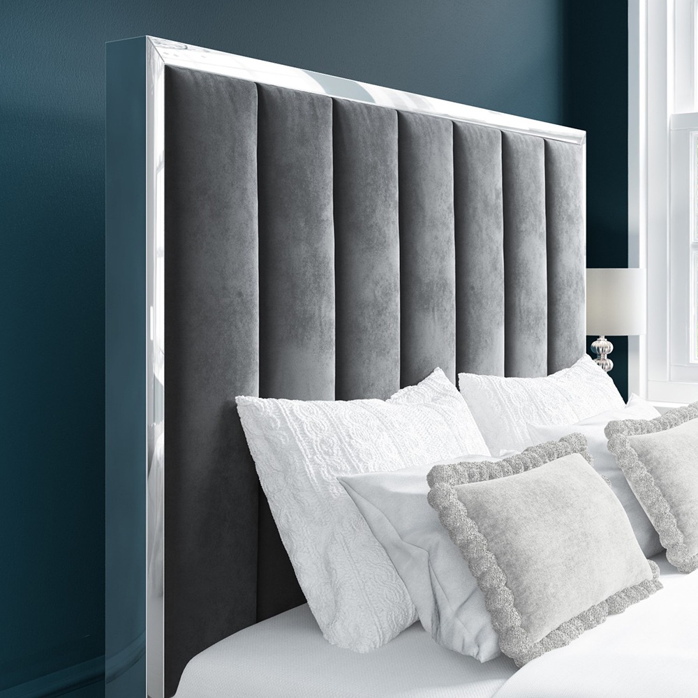 Home Mart Grey Velvet Double Ottoman Bed with Tall Headboard