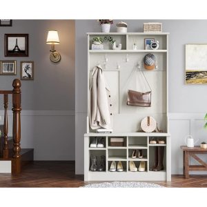 The Hall Tree with Storage Bench is a stylish and functional 3-in-1 entryway piece, offering a perfect blend of seating, storage, and organization. Designed to enhance any entryway or hallway, this multi-purpose unit provides ample storage space for shoes, bags, and other essentials, while the built-in bench offers a comfortable spot for putting on shoes or resting. The Hall Tree With Storage Bench, includes hooks for coats, hats, and scarves, helping to keep your space tidy and clutter-free. Whether you’re entering or exiting, this versatile piece makes your entryway both stylish and practical. Perfect for modern homes looking to maximize space.