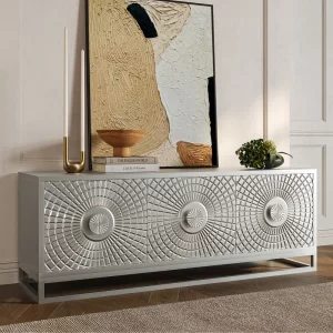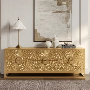 - Apart from its practicality as a TV stand, it doubles up as a work of art thanks to the meticulously crafted sun-themed relief, transforming any living room into an aesthetic retreat.