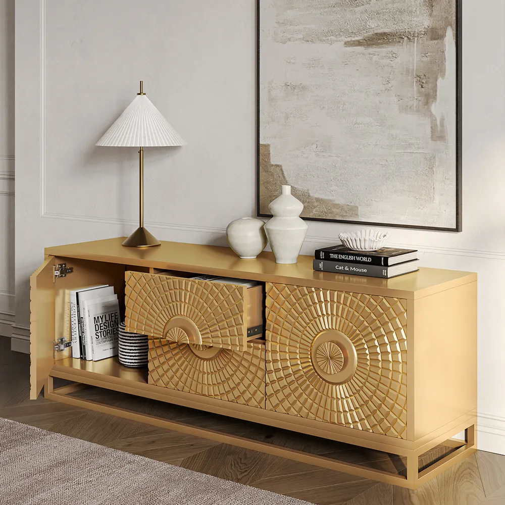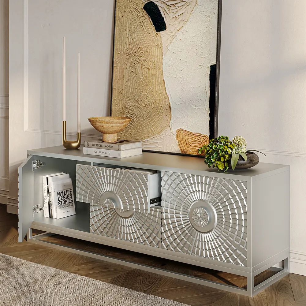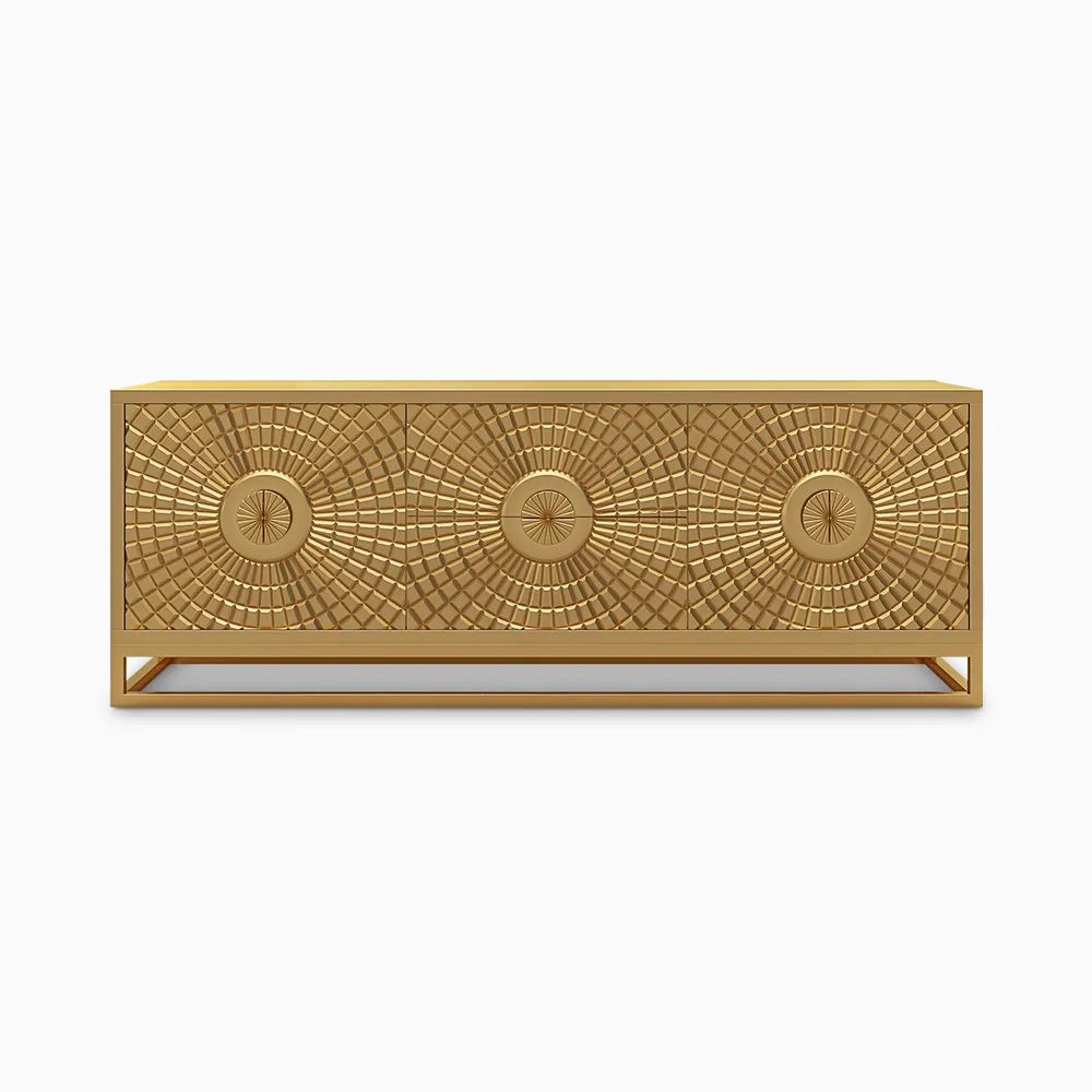 - Apart from its practicality as a TV stand, it doubles up as a work of art thanks to the meticulously crafted sun-themed relief, transforming any living room into an aesthetic retreat.