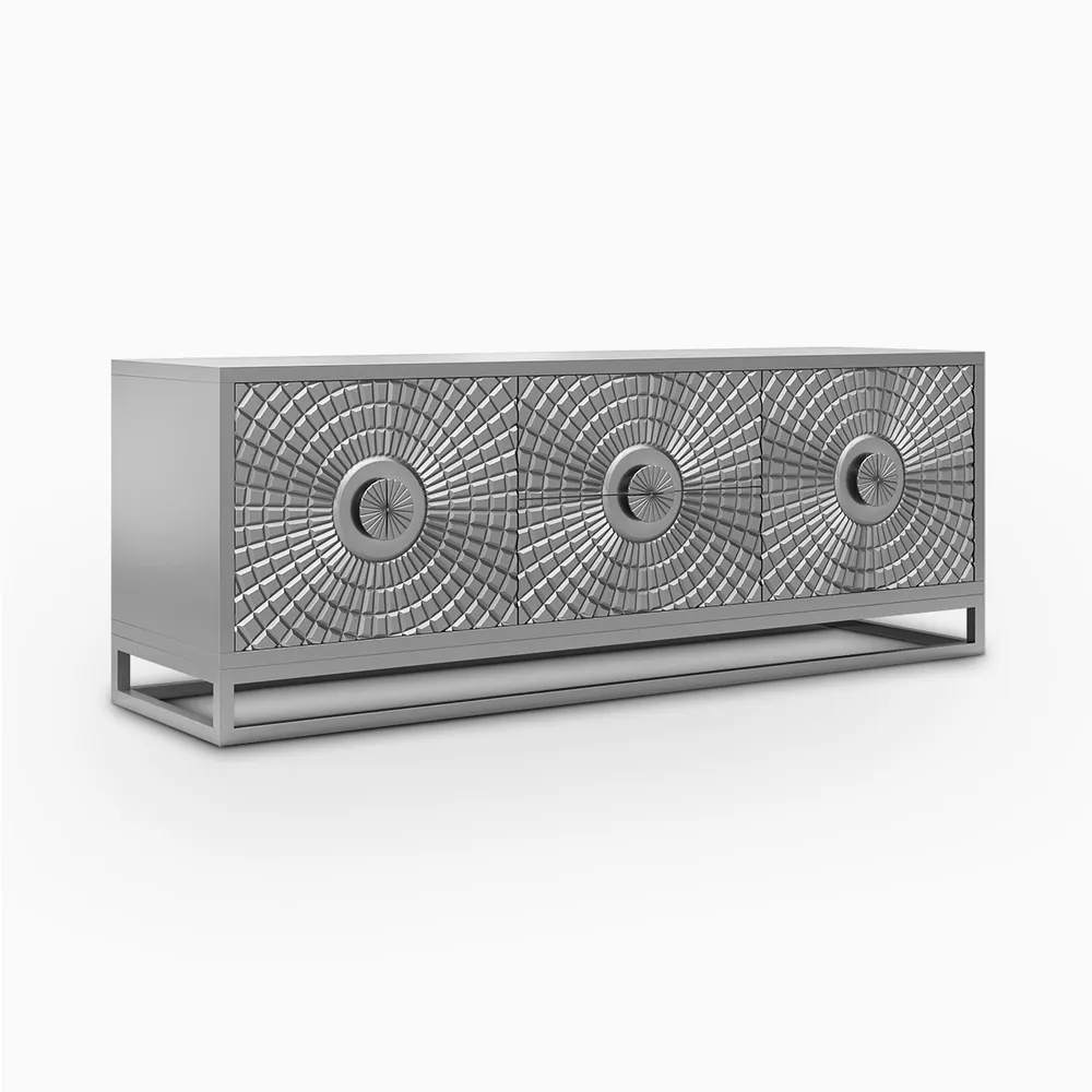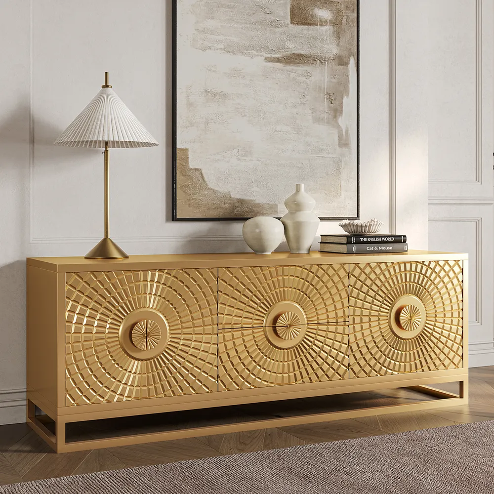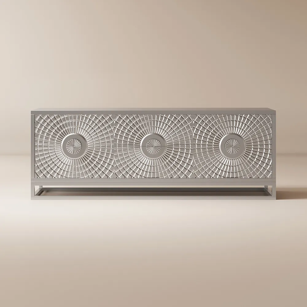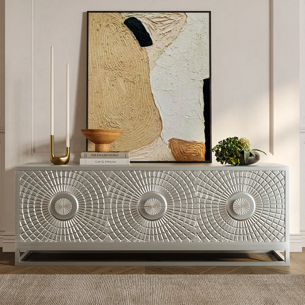- Apart from its practicality as a TV stand, it doubles up as a work of art thanks to the meticulously crafted sun-themed relief, transforming any living room into an aesthetic retreat.