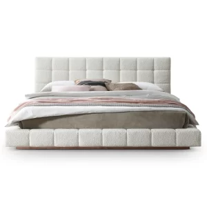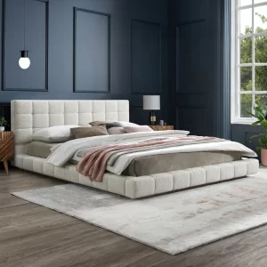 Effortlessly blending modern sophistication with everyday comfort, the Hughes King Platform Bed in plush ivory bouclé makes a bold yet inviting statement. Designed for both style and substance, it features a low-profile silhouette, robust wooden slats, and a reinforced center support—ensuring reliable durability without the need for a box spring. Its clean lines and textural elegance pair beautifully with Mid-Century Modern furnishings. Thoughtfully developed by Midinmod Furniture Stores in Houston, this bed is a seamless fit for contemporary interiors seeking a touch of timeless charm