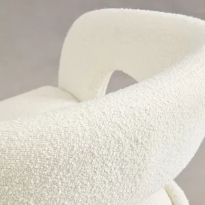 Polyester upholstery with a bouclé finish and 28 kg/m³ density foam padding provide warmth, sophistication, and comfort. The internal iron structure ensures durability, while a reinforced poplar plywood seat adds stability.