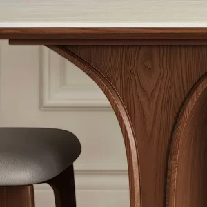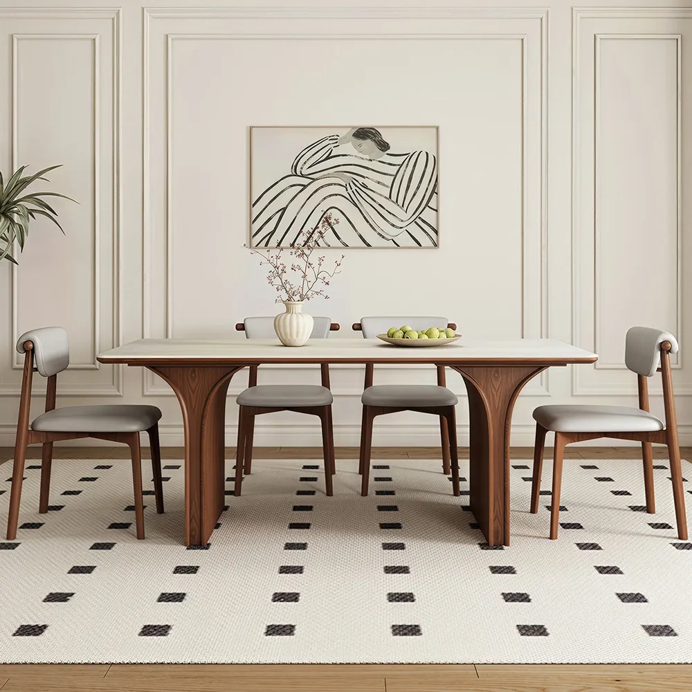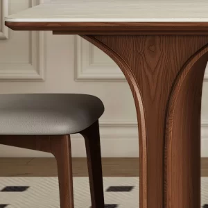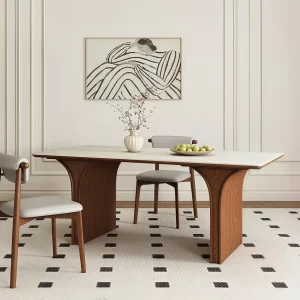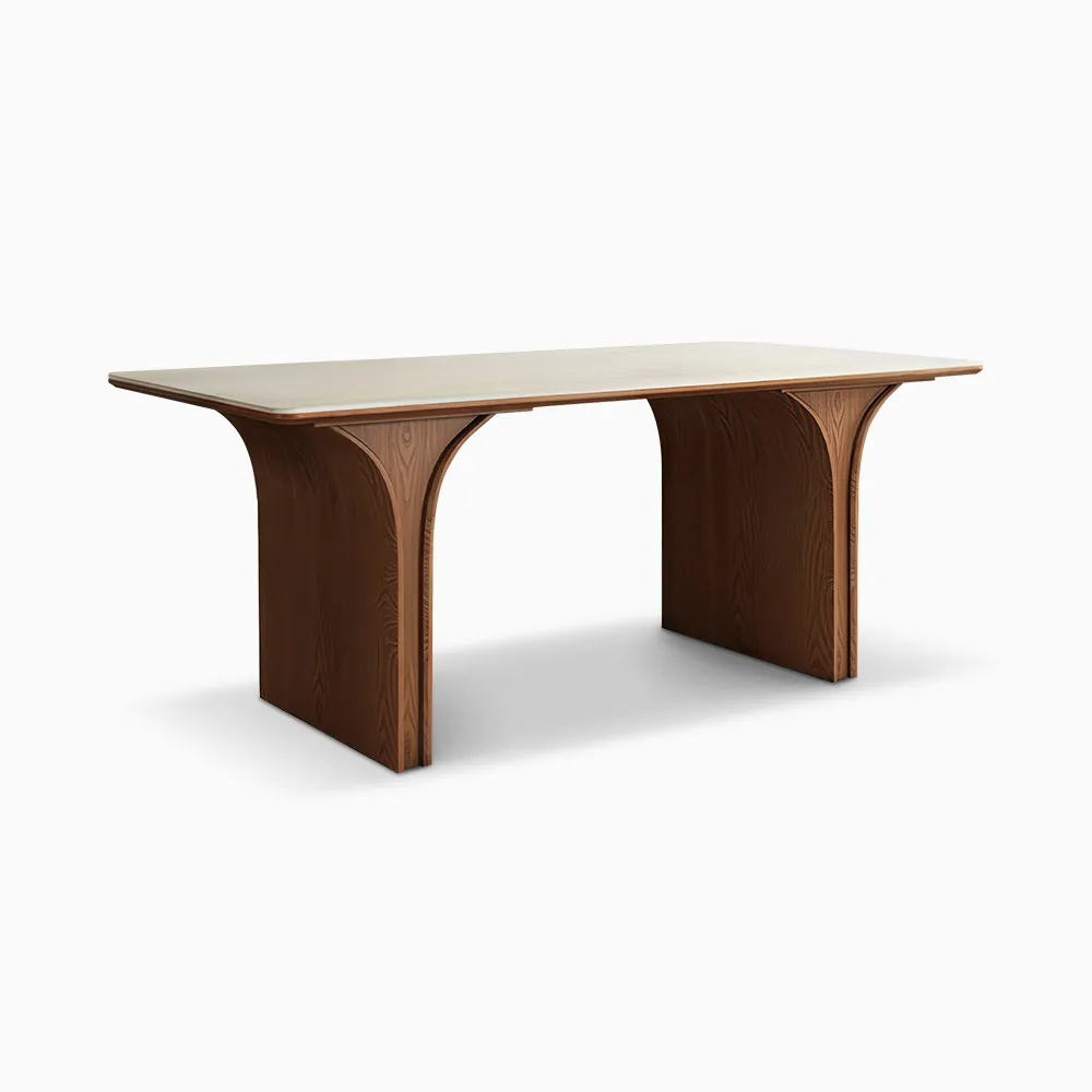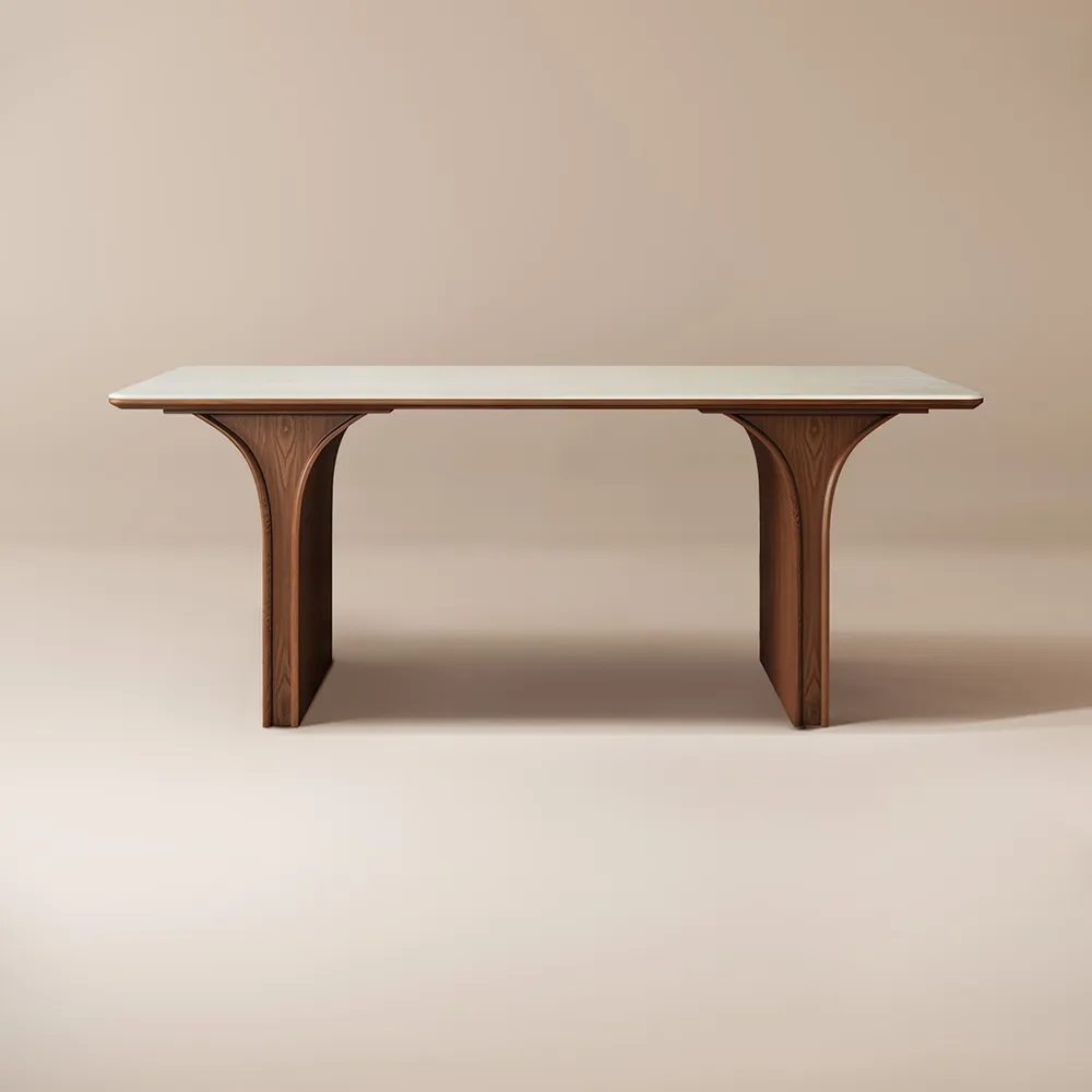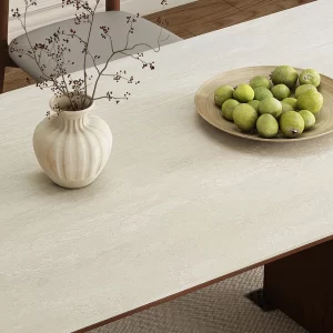 Elevate your dining space with our exquisite table, featuring a beige sintered stone and robust wooden legs for a timeless look that blends classic elegance with modern durability.