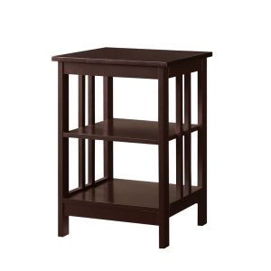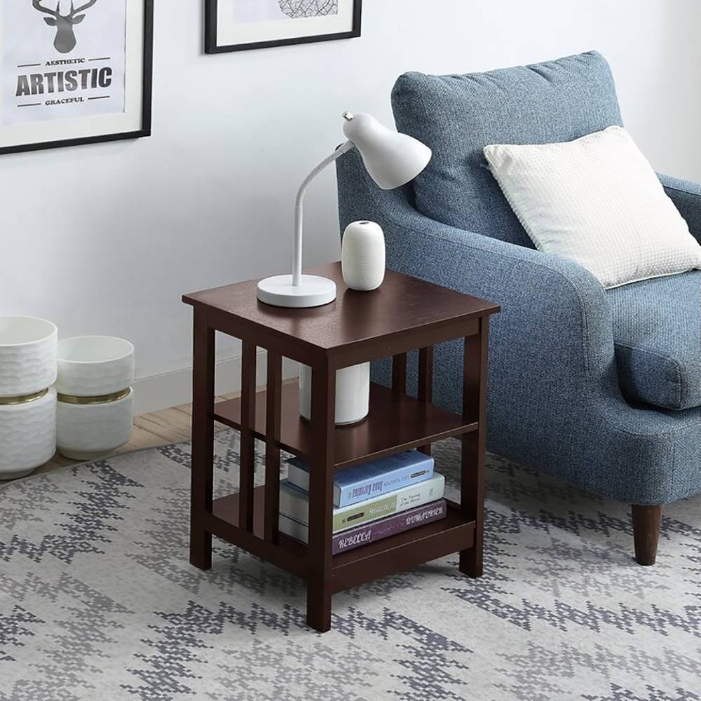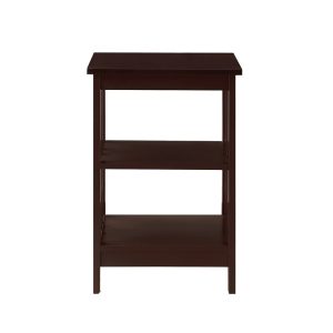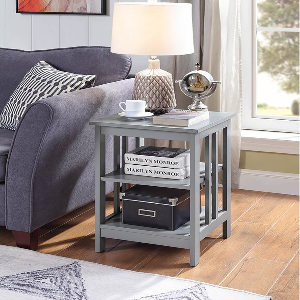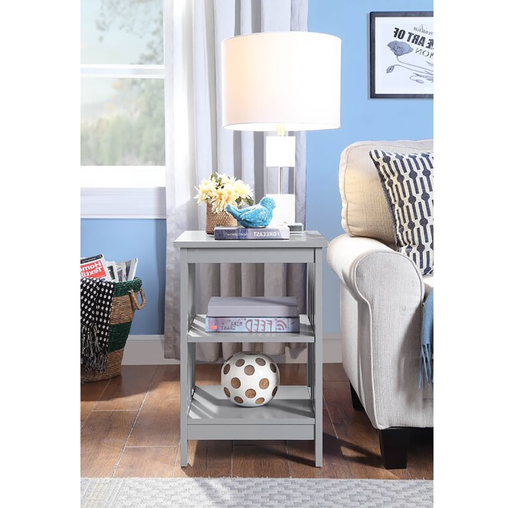 Give any sofa, seat, or bed a contemporary companion with this clean-lined end table. Made from engineered wood, this budget-friendly piece features an open frame and a neutral finish for an airy and approachable look. The surface top offers a convenient spot to stage a lamp, framed family photos, and more, while two lower tiers provide additional storage space. This compact design fits easily in narrow nooks and cramped corners.