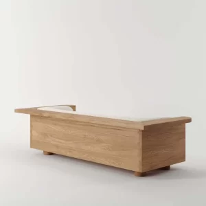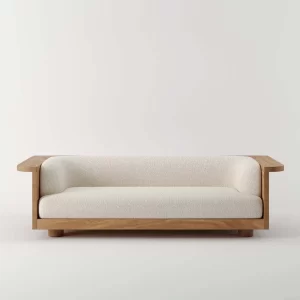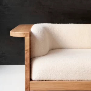 The Veneer wood contrasts with the upholstered curves of the seating, combining minimal lines with balanced and delicate roundness. The solid wood board, seemingly floating, adds a unique intention to the Nomad sofa, both aesthetically and functionally. The extended edges on both sides allow for personalization and the display of belongings.Â