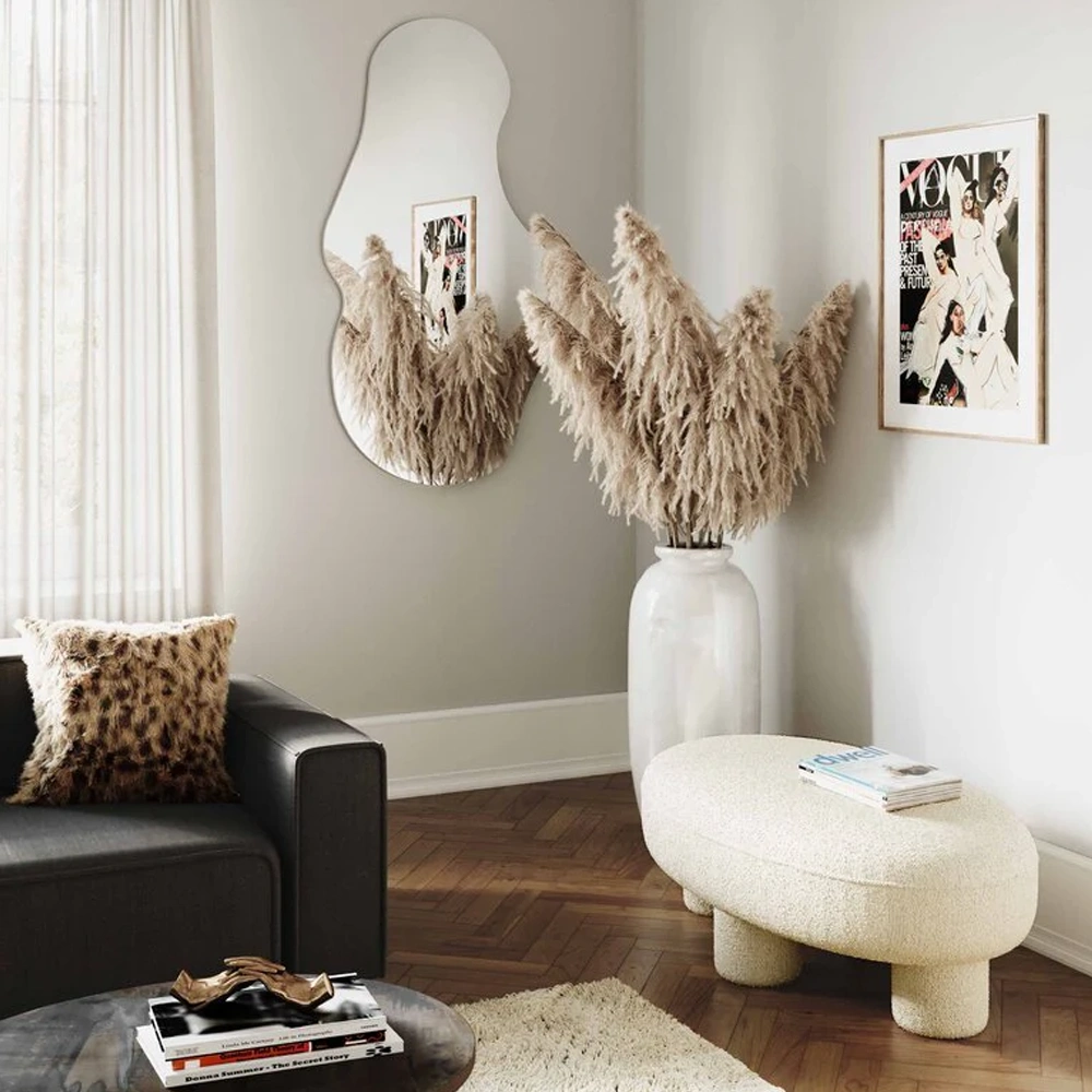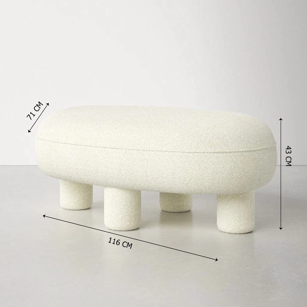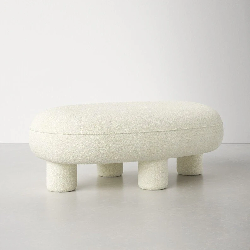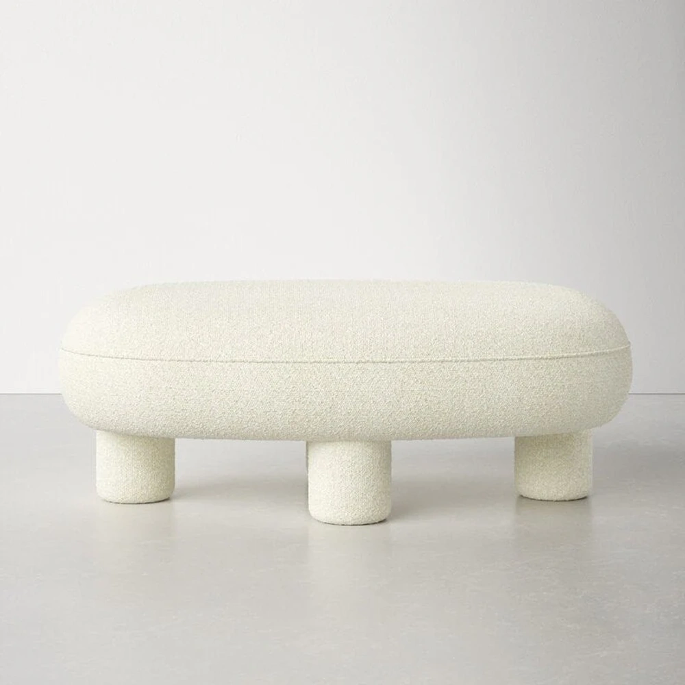 This ottoman is all the rage! This stylish piece features a fully upholstered solid wood frame and is perfect to use as a footrest, coffee table, or extra seat. Complement your boucle living room with this one-of-a-kind cozy textured boucle ottoman.