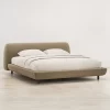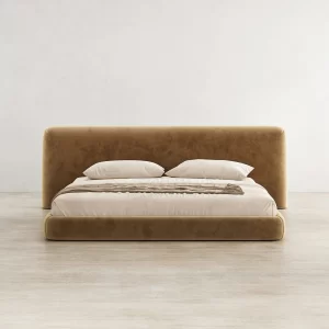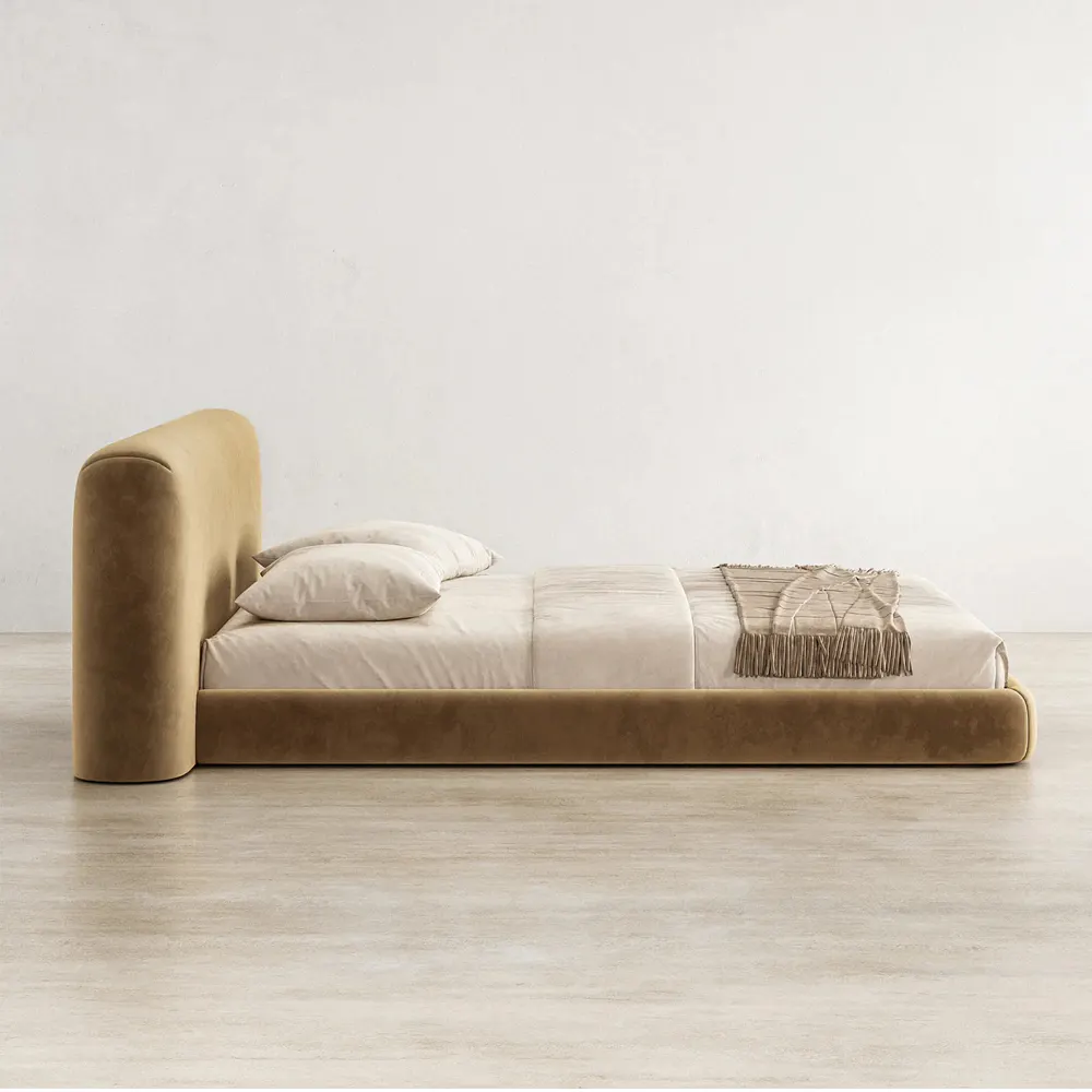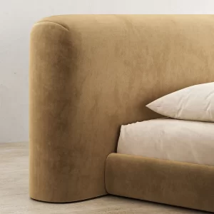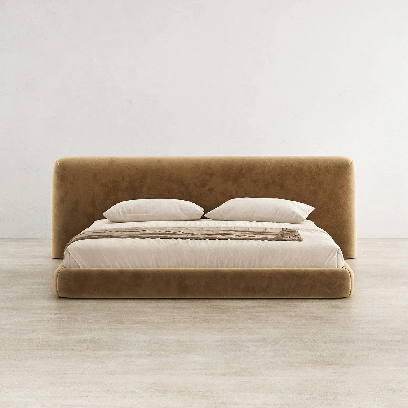 The Qube Bed features a plush, oversized headboard with a gently curved top that extends beyond the width of the bed frame, offering a modern yet cozy aesthetic. The entire piece is upholstered in a rich, camel-colored velvet fabric that provides a sumptuous texture and a luxurious feel. The bed frame itself is low-profile with a streamlined design that sits flush to the ground, accentuating its contemporary look.