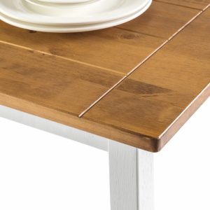 Sized to seat four, this compact dining table is the perfect pick for cozy eat-in kitchens and smaller dining spaces alike. Crafted from plywood, this design measures just 115cm L x 75cm H x 90cm D. A warm brown finish outfits the rectangular top for a natural touch, while the base sports a white finish for a subtle contrast.