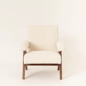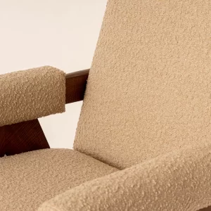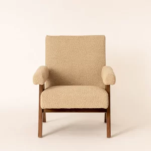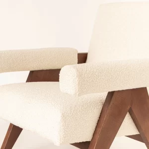 The unique arms are padded with the highest quality foam padding and upholstered with textured bouclé fabric giving a soft finish to the architectural piece. The generous bouclé seat is supported by a teak stained solid timber frame. Bouclé Easy Lounge Chair with Arms, which marries warmth and texture. Our Bouclé Easy Lounge Chair with Arms is a reimagined take on Mid-Century Modern lounge chairs.