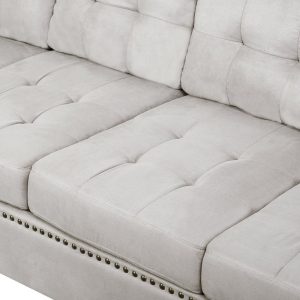 Specialized L-Shaped sectional sofa set design to allow for spacious seating; smoothed block foot peg foundation for elevated sturdy support; classic nail head trimming provides eye-catching detail. Constructed with a solid rubber frame and covered with soft micro suede fabric. The high-gauge sinuous spring foundation and high-density sponge are adopted to offer ideal comfort with no compromise to style, which is great for your gathering, naps, and relaxation.