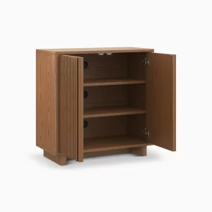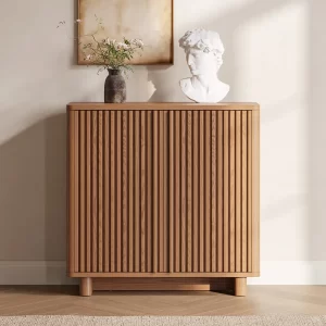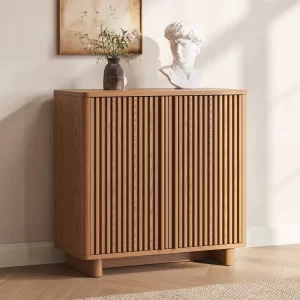 With clean lines and a minimalist design at its core, vertical stripes adorn this piece, enhancing its three-dimensional and layered appeal to underscore the sophistication and understated elegance of modern furniture. Featuring adjustable shelves across three tiers internally, it facilitates seamless storage. This sideboard transcends the dining room, finding utility in various settings like the living room, entryway, and beyond, serving as a versatile storage or decorative unit.