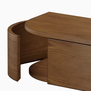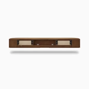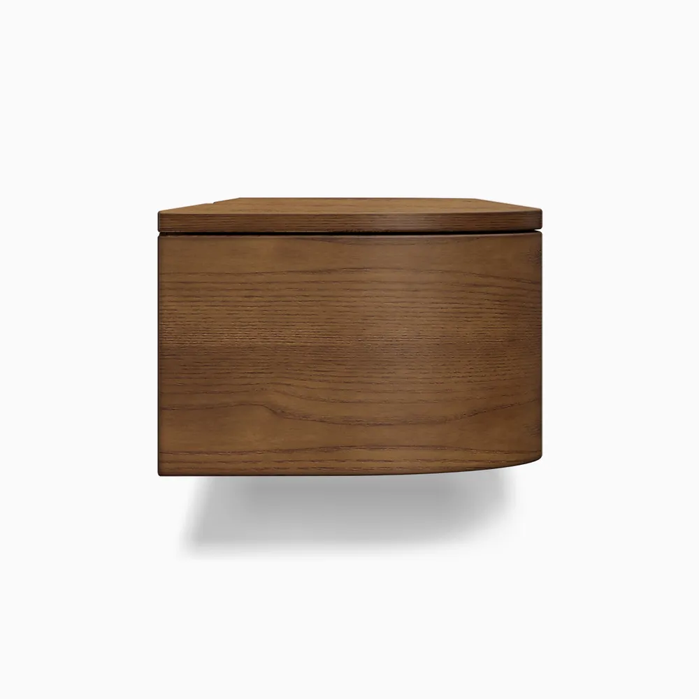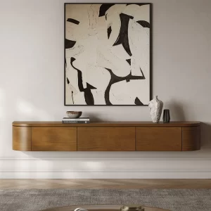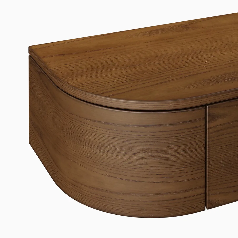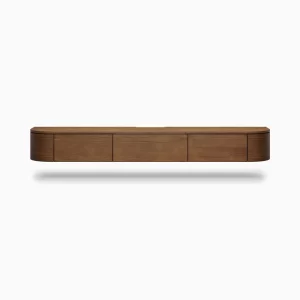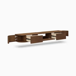This TV cabinet features a sleek floating design with smooth rounded edges that exude modern sophistication. Its seamless wooden facade offers a warm natural touch while the concealed storage compartments maintain a clean minimalist look. Perfect for contemporary interiors, it elegantly combines functionality with refined aesthetics.